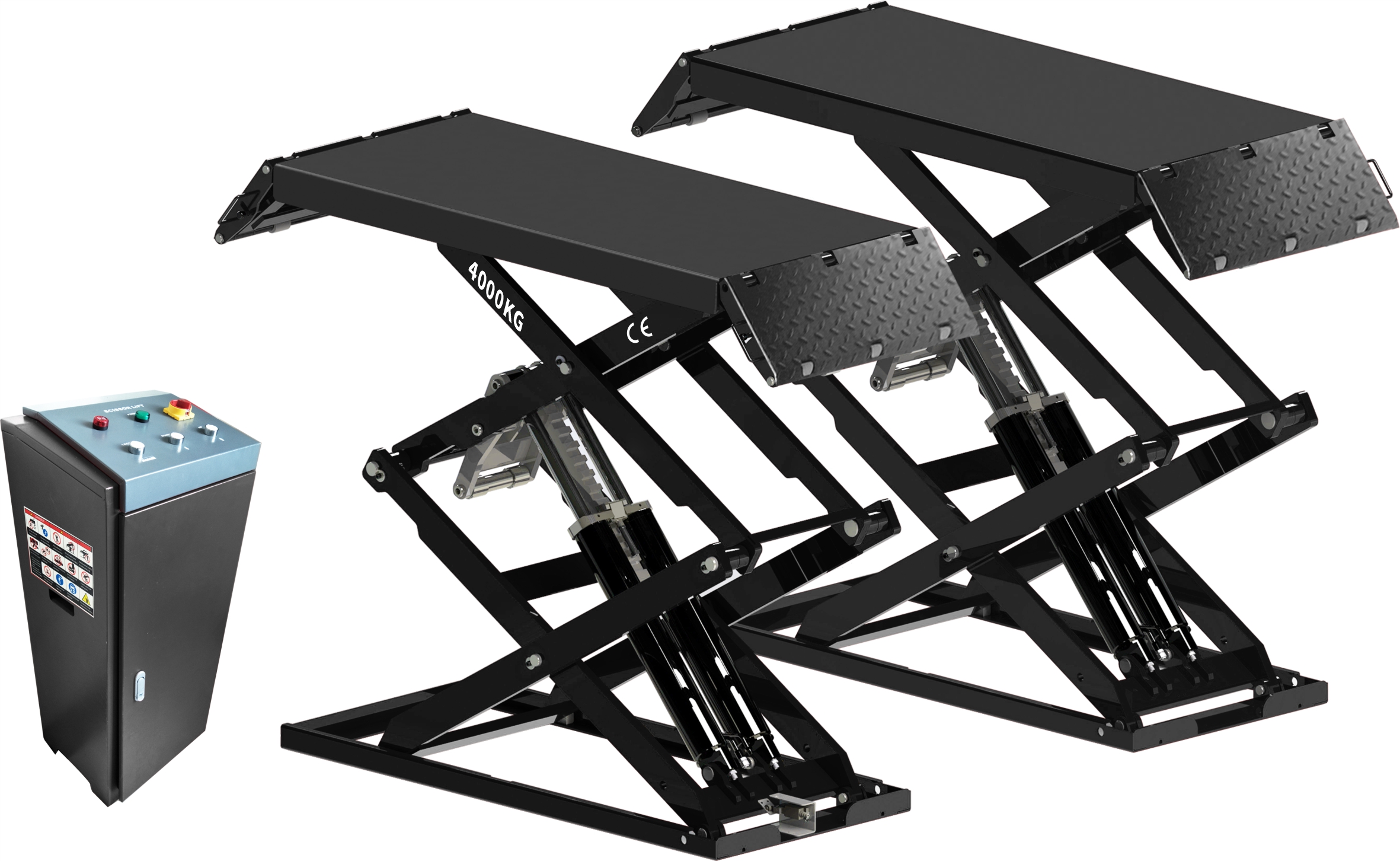 ELEKTRONIKA HSC40A, škarjasto elektrohidravlično dvigalo za vgradnjo na tla, nosilnost 4.000 kg, avtomatsko odklepanje varovala